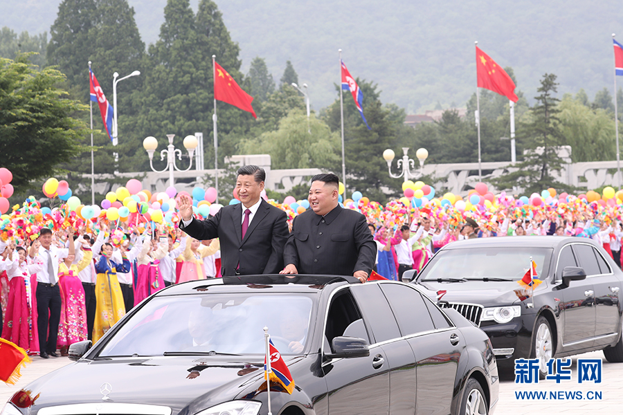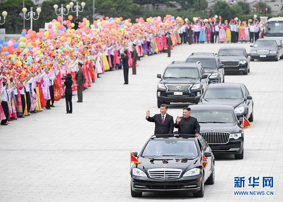習(xí)近平抵達(dá)黎明大街路口,換乘敞篷車,與金正恩同車前往錦繡山太陽宮廣場。街道兩旁,人山人海,盛況空前。歡迎民眾站在高坡上,從住宅樓的窗臺上,向中國貴賓歡呼致敬。到處都是熱情的笑臉,友好的歡呼聲不絕于耳。習(xí)近平和金正恩向歡迎的人群頻頻揮手致意。