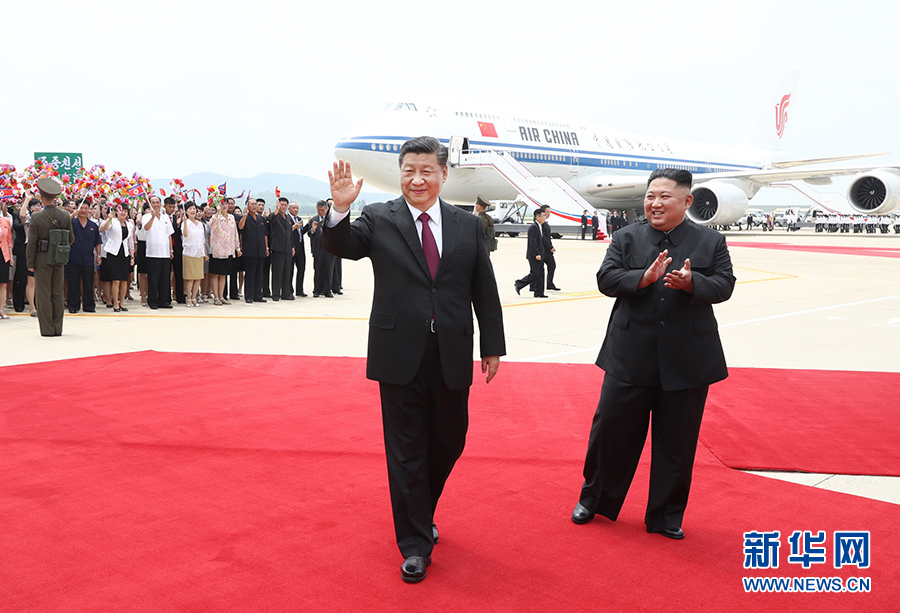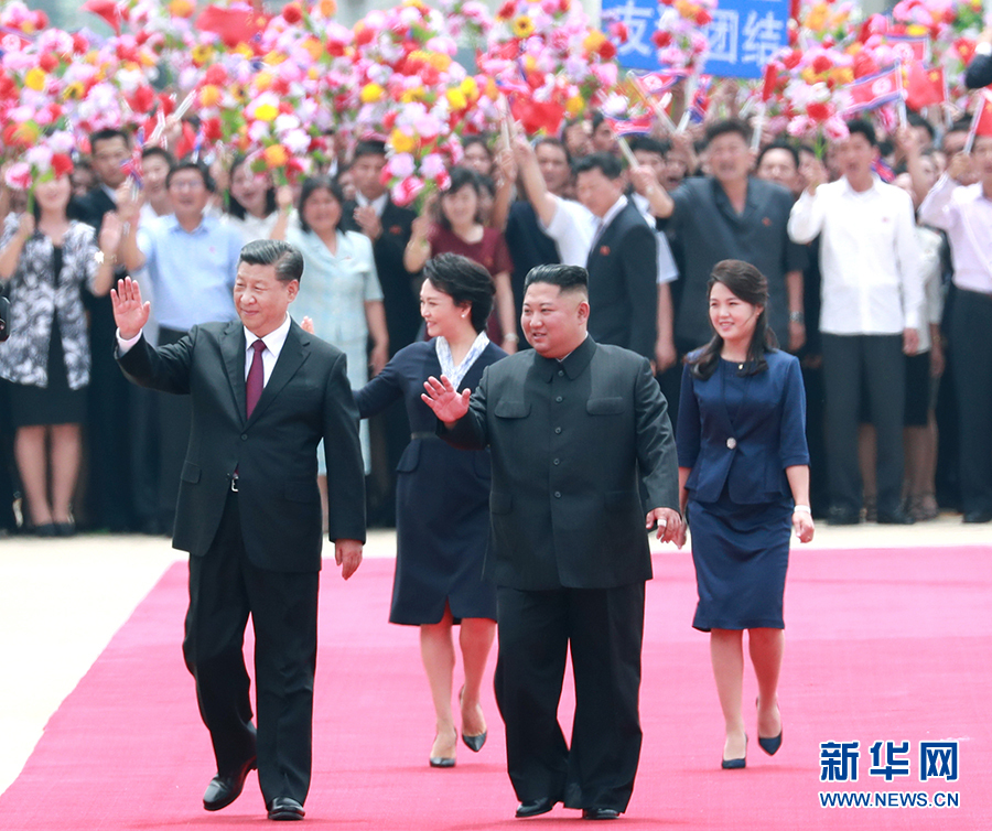 當(dāng)?shù)貢r間12時許,習(xí)近平乘坐的專機(jī)抵達(dá)平壤順安機(jī)場。雨后初晴的平壤,天高云淡、氣候怡人,到處郁郁蔥蔥、繁花似錦,整個城市洋溢著友好熱烈的氣氛。機(jī)場上中朝兩國國旗迎風(fēng)飄揚(yáng),“熱烈歡迎中國共產(chǎn)黨中央委員會總書記、中華人民共和國主席習(xí)近平同志”“鮮血凝成的朝中兩國人民之間牢不可破的友誼團(tuán)結(jié)萬歲”大幅標(biāo)語高高懸掛,近萬名群眾排列成整齊的隊伍,有力地?fù)]動著花束,以歡快的口號和熱情的笑容,歡迎尊貴的中國客人到來。朝鮮勞動黨委員長、國務(wù)委員會委員長金正恩和夫人李雪主到機(jī)場迎接。