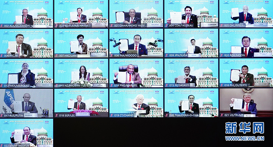 11月20日晚,國家主席習(xí)近平在北京以視頻方式出席亞太經(jīng)合組織第二十七次領(lǐng)導(dǎo)人非正式會議并發(fā)表重要講話。這是與會各經(jīng)濟體領(lǐng)導(dǎo)人、代表通過《2040年亞太經(jīng)合組織布特拉加亞愿景》并線上合影。 新華社記者 李響 攝