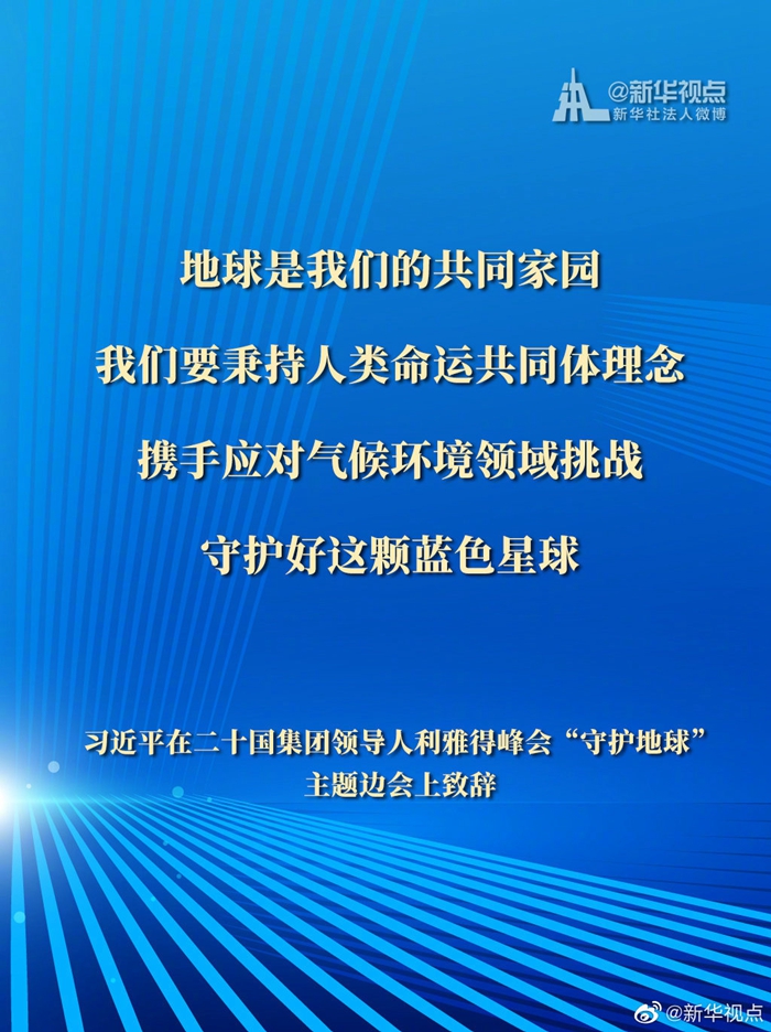 國家主席習(xí)近平11月22日在二十國集團(tuán)領(lǐng)導(dǎo)人利雅得峰會(huì)“守護(hù)地球”主題邊會(huì)上致辭時(shí)表示,地球是我們的共同家園。我們要秉持人類命運(yùn)共同體理念,攜手應(yīng)對(duì)氣候環(huán)境領(lǐng)域挑戰(zhàn),守護(hù)好這顆藍(lán)色星球。