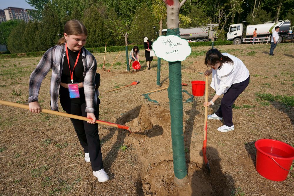 2024年4月20日,美国马斯卡廷中学学生与石家庄外国语学校学生在河北正定的“中美友谊传承青年林”共同植树。新华社记者 张粲 摄