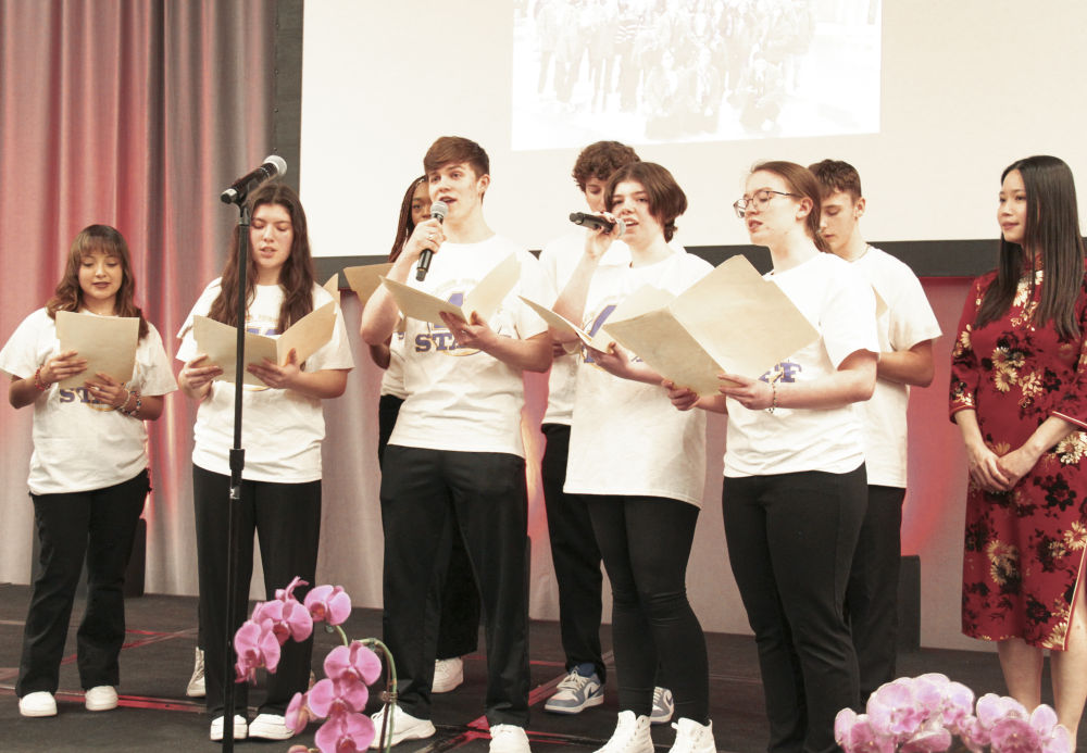 2024年2月27日,在美国芝加哥,马斯卡廷中学学生用中文演唱《情缘留住永恒的记忆》。新华社记者 徐静 摄
