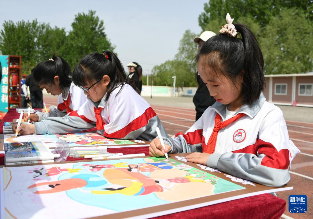 4月19日,门楼中心小学的学生在活动中绘制鼓面。