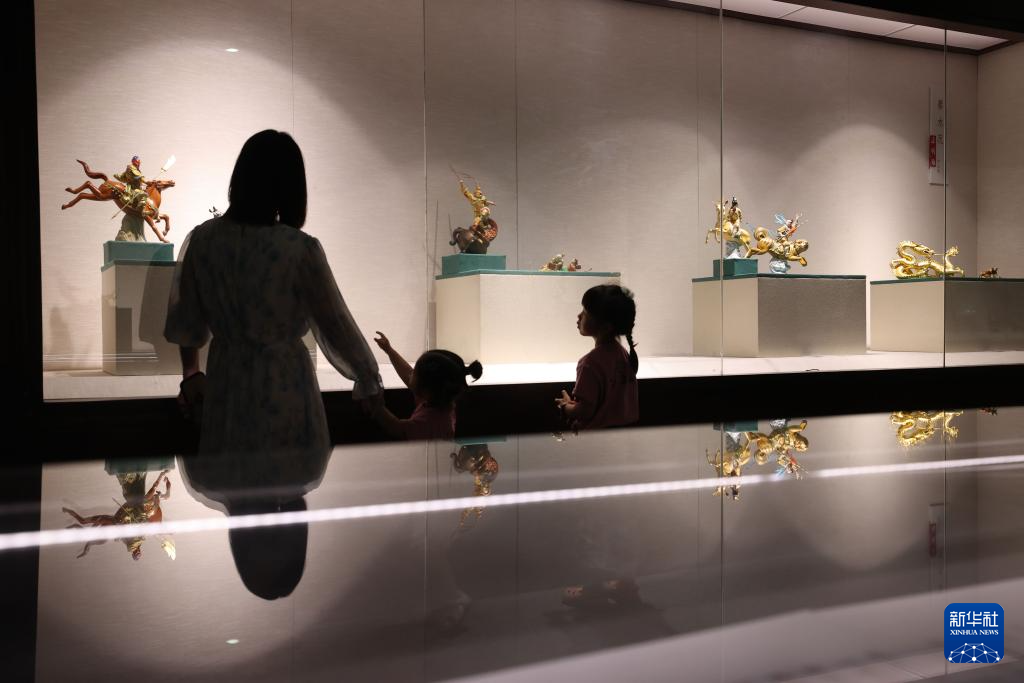 5月18日,家长带着孩子在福建省厦门市博物馆参观展出的漆线雕作品。