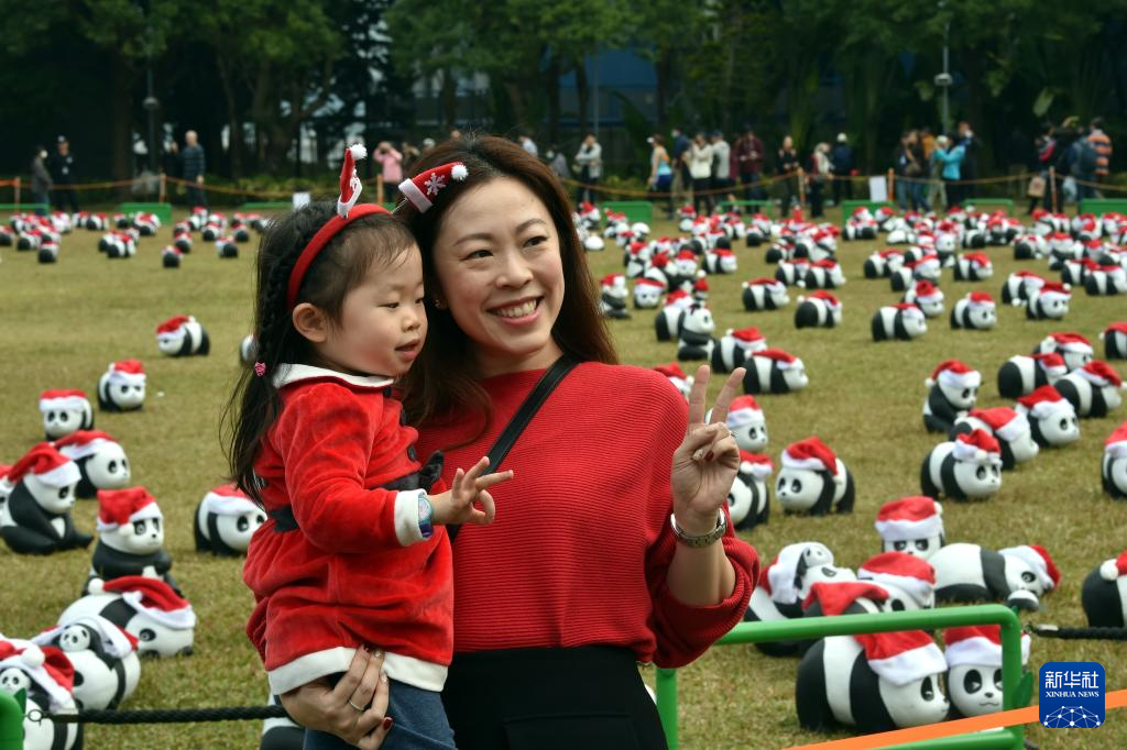 12月25日,大熊猫雕塑在香港中山纪念公园草地上展出。
