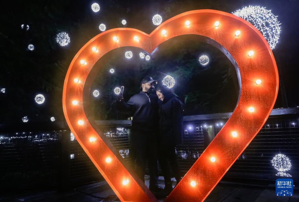 加拿大北温哥华的卡皮拉诺吊桥公园近日举行情人节主题灯光活动,为即将到来的节日增添浪漫氛围。