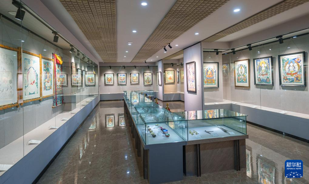 这是2月10日拍摄的西藏唐卡画院展厅。陈列的唐卡中有许多罗布斯达的作品。