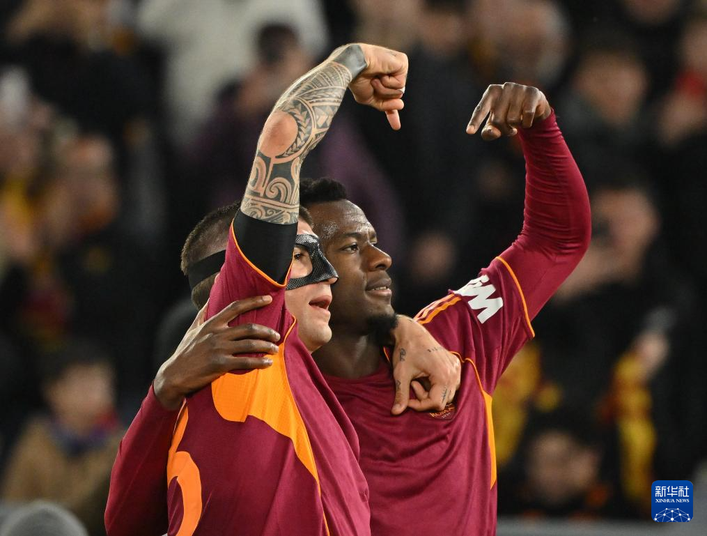 3月1日,罗马队球员恩迪卡(右)与队友曼奇尼庆祝进球。新华社发(阿尔贝托·林格利亚摄)