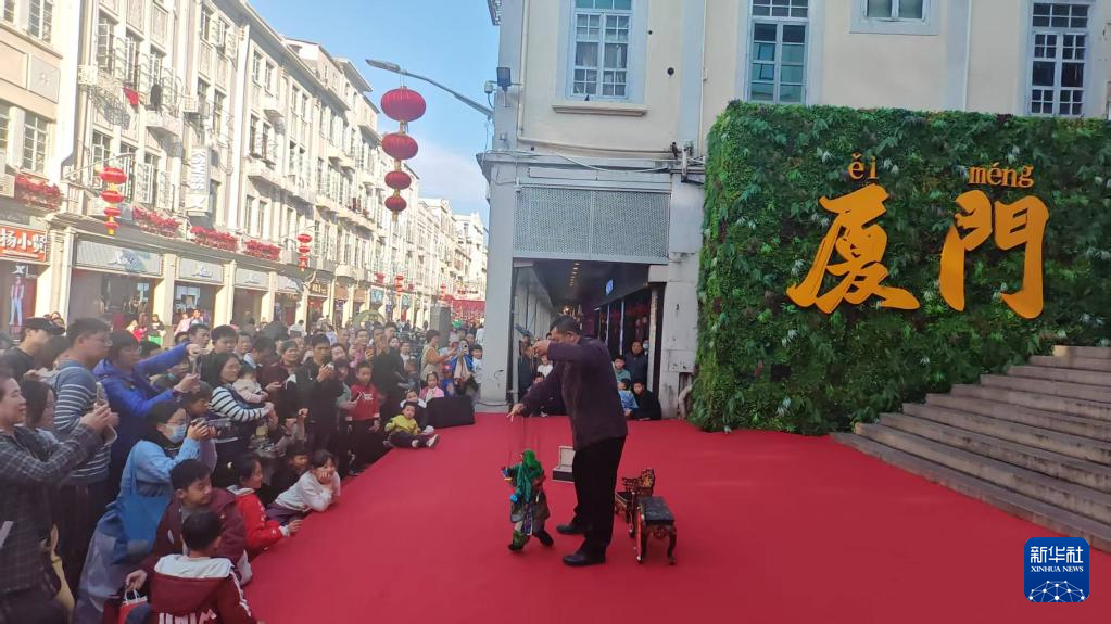 春节前夕,金门傀儡戏剧团团长蔡远进在厦门中山路表演木偶戏(2026年2月12日摄)。新华社发
