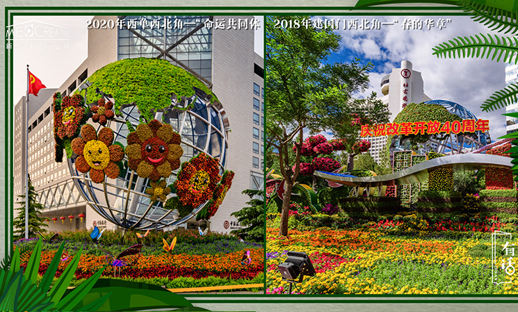 花壇的創(chuàng)新包括花材的創(chuàng)新,新花材的應(yīng)用成為設(shè)計(jì)師的重要任務(wù)。我這幾年經(jīng)常來往于云南、廣西邊遠(yuǎn)山區(qū)之間,親眼目睹了百姓脫貧致富的經(jīng)歷。當(dāng)?shù)匕傩諒膯我坏霓r(nóng)作物耕種到種植果蔬再到種植花卉,其中彩花矮化的三角梅就是最受歡迎的花卉品種。2018年我們在西單西北角“幸福生活”花壇里用三角梅設(shè)計(jì)了一棵繽紛的花樹,造型自然、色彩斑駁、栩栩如生,深受大家的喜愛,被百姓評為“最美花樹”,這極大地激勵(lì)著我們用新興花材搞設(shè)計(jì)。今年的花壇依然采用了來自偏遠(yuǎn)山區(qū)的三角梅,這對于決勝全面小康具有非凡的意義。