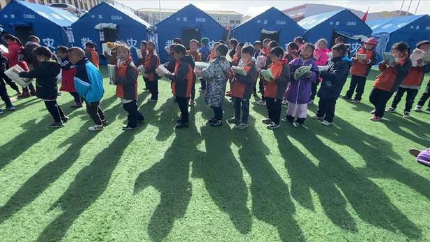 當(dāng)日,青海省果洛藏族自治州瑪多縣地震災(zāi)區(qū)中小學(xué)全面復(fù)課,來自瑪多縣民族寄宿制中學(xué)的八年級學(xué)生曲邁卓瑪與870多位同學(xué)一起,在帳篷學(xué)校迎來了復(fù)課。