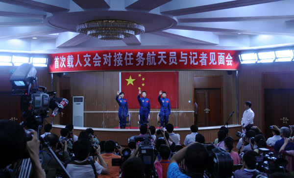 高清:首次載人交會對接任務(wù)航天員與記者見面