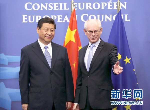 ????新華網(wǎng)布魯塞爾3月31日電(記者 魏建華 錢(qián)彤)國(guó)家主席習(xí)近平31日在布魯塞爾同歐洲理事會(huì)主席范龍佩舉行會(huì)談。雙方就新形勢(shì)下深化中歐全面戰(zhàn)略伙伴關(guān)系廣泛深入交換意見(jiàn),達(dá)成重要共識(shí)。習(xí)近平強(qiáng)調(diào),要從戰(zhàn)略高度看待中歐關(guān)系,將中歐兩大力量、兩大市場(chǎng)、兩大文明結(jié)合起來(lái),共同打造中歐和平、增長(zhǎng)、改革、文明四大伙伴關(guān)系,為中歐合作注入新動(dòng)力,為世界發(fā)展繁榮作出更大貢獻(xiàn)。