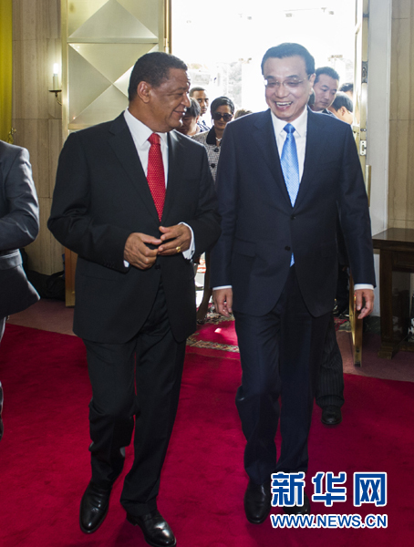 國務(wù)院總理李克強(qiáng)當(dāng)?shù)貢r間6日上午在亞的斯亞貝巴國家宮會見埃塞俄比亞總統(tǒng)穆拉圖。