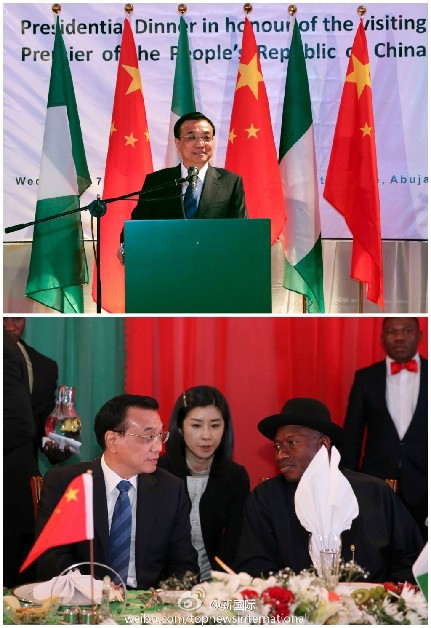 ??? 新華網(wǎng)北京5月8日電? 據(jù)新華社“新國(guó)際”微博報(bào)道,當(dāng)?shù)貢r(shí)間7日晚,尼日利亞總統(tǒng)喬納森夫婦在總統(tǒng)府為李克強(qiáng)總理和夫人程虹舉行隆重歡迎宴會(huì)?,F(xiàn)場(chǎng)尼方兩次奏響中國(guó)國(guó)歌,感謝李克強(qiáng)在尼安全局勢(shì)嚴(yán)峻時(shí)刻“冒險(xiǎn)”訪問,感謝中方對(duì)尼的巨大支持。