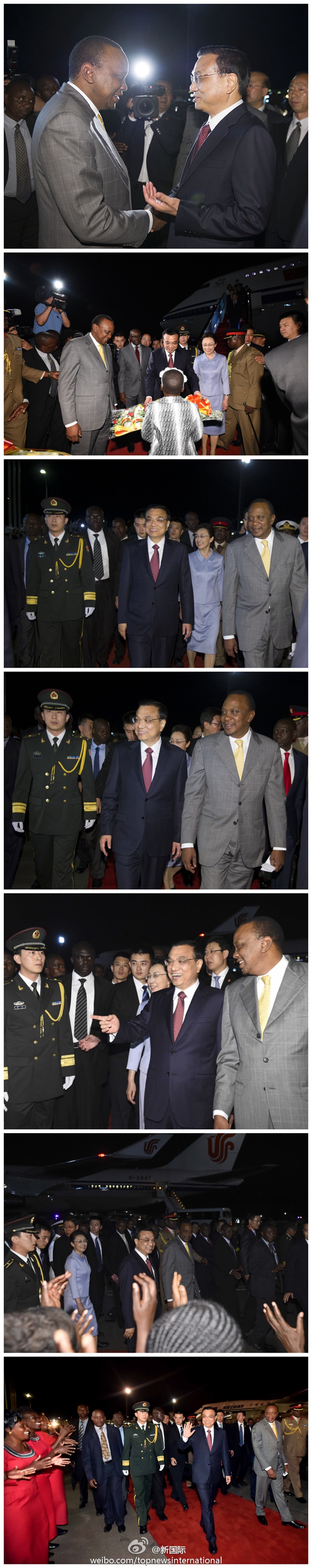 ????新華網(wǎng)北京5月10日電? 據(jù)新華社“新國(guó)際”微博報(bào)道,李克強(qiáng)總理9日晚乘專機(jī)抵達(dá)內(nèi)羅畢,肯尼亞總統(tǒng)肯雅塔和副總統(tǒng)魯托率肯政府高級(jí)官員到機(jī)場(chǎng)迎接,當(dāng)?shù)孛癖娨允⒋蟮奶厣褡甯栉?,歡迎中國(guó)貴賓到來。