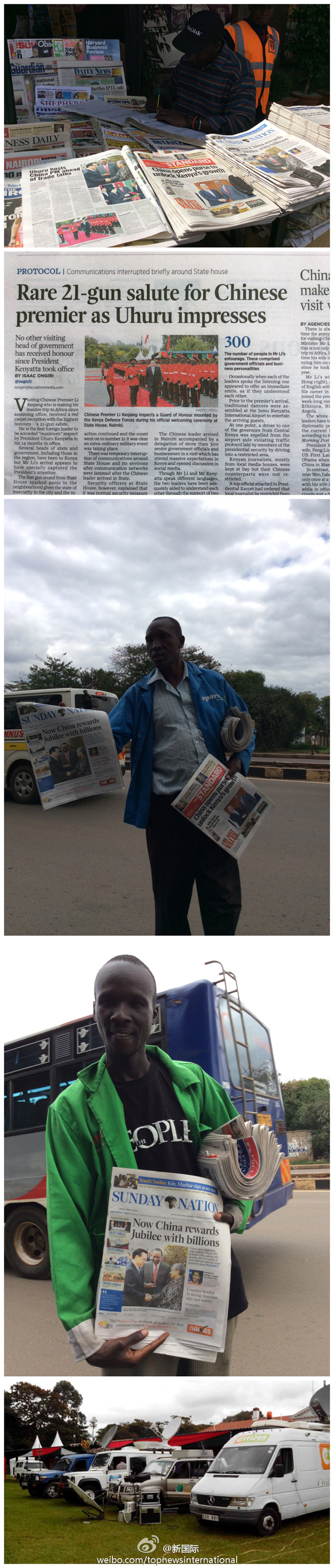 ????新華網(wǎng)北京5月11日電? 據(jù)新華社“新國(guó)際”微博報(bào)道,連日來,肯尼亞各大媒體紛紛對(duì)李克強(qiáng)總理訪肯進(jìn)行全方位報(bào)道。主要報(bào)紙均在頭版頭條大篇幅介紹訪問情況,并開辟專版引述李總理講話對(duì)肯中關(guān)系進(jìn)行述評(píng)。肯三大電視臺(tái)現(xiàn)場(chǎng)直播李總理和肯雅塔總統(tǒng)會(huì)見記者實(shí)況??厦襟w還高度評(píng)價(jià)中國(guó)在文化教育等領(lǐng)域的軟實(shí)力外交。