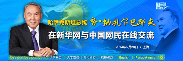 ??? 新華網(wǎng)上海5月20日電 哈薩克斯坦總統(tǒng)納扎爾巴耶夫20日接受新華網(wǎng)獨家訪談與中國網(wǎng)民在線交流,回答中國網(wǎng)民的問題。