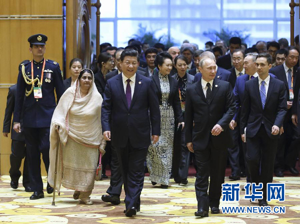 ??? 5月20日,國家主席習(xí)近平在上海國際會議中心舉行宴會,代表中國政府和人民,歡迎前來出席亞洲相互協(xié)作與信任措施會議第四次峰會的各國貴賓。這是習(xí)近平和彭麗媛同各國貴賓一起步入宴會廳。新華社記者 蘭紅光 攝