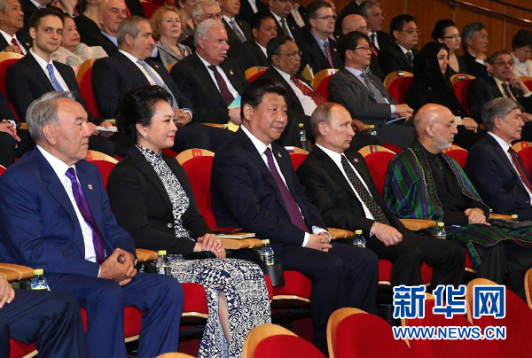??? 5月20日,國家主席習(xí)近平在上海國際會議中心舉行宴會,代表中國政府和人民,歡迎前來出席亞洲相互協(xié)作與信任措施會議第四次峰會的各國貴賓。歡迎宴會后,“團(tuán)結(jié)和諧的亞洲-攜手向明天”-亞洲相互協(xié)作與信任措施會議第四次峰會文藝晚會在上海大劇院舉行。這是習(xí)近平和彭麗媛同與會各國貴賓共同觀看文藝晚會。新華社記者 龐興雷 攝
