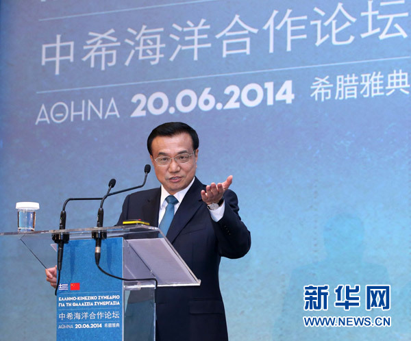 ??? 6月20日,國務(wù)院總理李克強(qiáng)在雅典與希臘總理薩馬拉斯共同出席中希海洋合作論壇并發(fā)表演講。新華社記者 龐興雷 攝