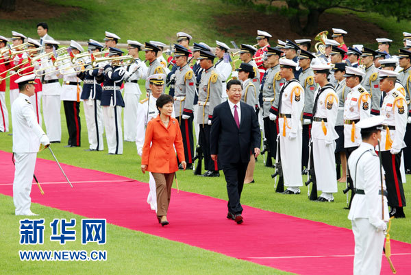 ??? 7月3日,國家主席習(xí)近平在首爾同韓國總統(tǒng)樸槿惠舉行會(huì)談。會(huì)談前,樸槿惠在青瓦臺(tái)總統(tǒng)府為習(xí)近平舉行隆重歡迎儀式。 新華社記者姚大偉攝