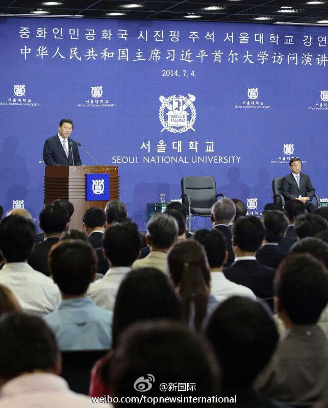 ??? 新華網(wǎng)北京7月4日電 據(jù)新華社“新國(guó)際”微博報(bào)道,首爾大學(xué)的大講堂座無(wú)虛席,傾聽(tīng)中國(guó),感受中韓夢(mèng)想的交匯。習(xí)主席說(shuō),要有海納百川的胸懷,以開(kāi)放包容心態(tài)虛心傾聽(tīng)世界的聲音。中國(guó)將繼續(xù)向世界學(xué)習(xí)、向各國(guó)人民學(xué)習(xí),學(xué)習(xí)人類創(chuàng)造的一切文明成果,推動(dòng)中國(guó)和世界發(fā)展得更好。?