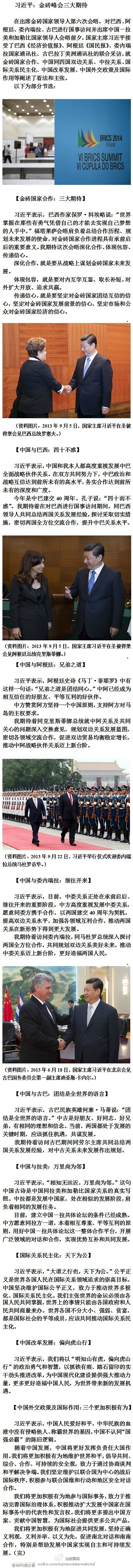 ???? 新華網(wǎng)北京7月15日電 據(jù)新華社“新國際”微博報(bào)道,在出席金磚國家領(lǐng)導(dǎo)人第六次會晤,對巴西、阿根廷、委內(nèi)瑞拉、古巴進(jìn)行國事訪問并出席中國-拉美和加勒比國家領(lǐng)導(dǎo)人會晤前夕,國家主席習(xí)近平接受了巴西《經(jīng)濟(jì)價值報(bào)》、阿根廷《國民報(bào)》、委內(nèi)瑞拉國家通訊社、古巴拉丁美洲通訊社的聯(lián)合采訪。精彩內(nèi)容請點(diǎn)長微博。?
