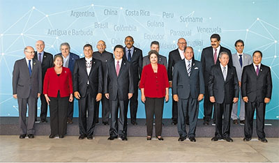 ? 當(dāng)?shù)貢r(shí)間7月17日下午,中國(guó)—拉美和加勒比國(guó)家領(lǐng)導(dǎo)人會(huì)晤在巴西利亞舉行。本次會(huì)晤由中方倡議,中國(guó)國(guó)家主席習(xí)近平、巴西總統(tǒng)羅塞夫、哥斯達(dá)黎加總統(tǒng)索利斯、古巴國(guó)務(wù)委員會(huì)主席兼部長(zhǎng)會(huì)議主席勞爾·卡斯特羅、厄瓜多爾總統(tǒng)科雷亞、蘇里南總統(tǒng)鮑特塞、哥倫比亞總統(tǒng)桑托斯、智利總統(tǒng)巴切萊特、圭亞那總統(tǒng)拉莫塔爾、烏拉圭總統(tǒng)穆希卡、委內(nèi)瑞拉總統(tǒng)馬杜羅、安提瓜和巴布達(dá)總理布朗等出席。