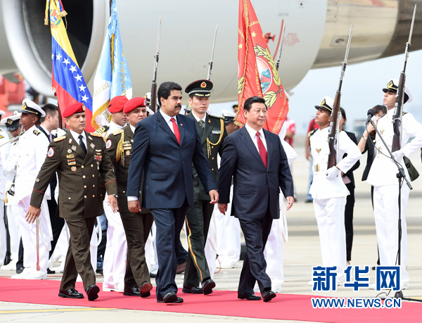 ??? 當?shù)貢r間7月20日,國家主席習近平抵達加拉加斯,開始對委內瑞拉進行國事訪問。委內瑞拉總統(tǒng)馬杜羅在機場為習近平舉行隆重歡迎儀式。新華社記者劉建生攝
