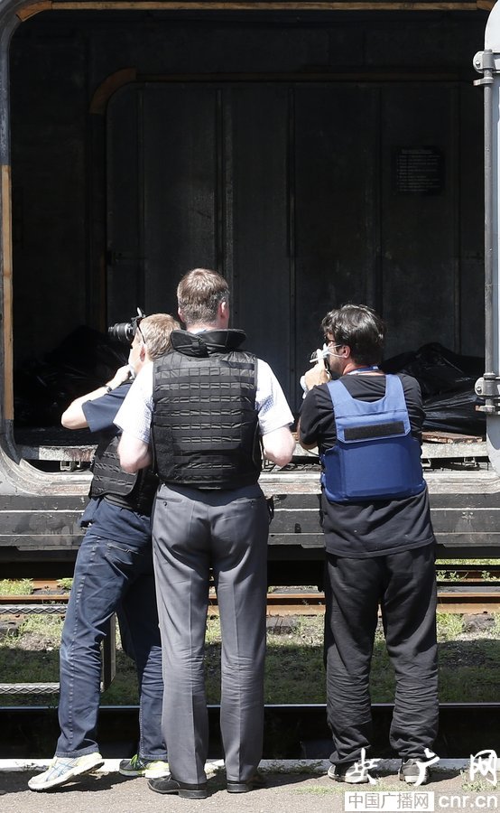 當(dāng)?shù)貢r(shí)間2014年7月20日,烏克蘭頓涅茨克Torez,馬航墜機(jī)遇難乘客遺體被裝上列車(chē)?yán)洳剀?chē)廂將被運(yùn)走。載有部分遺體的火車(chē)從距空難現(xiàn)場(chǎng)不遠(yuǎn)的烏克蘭托列茲市出發(fā),前往頓涅茨克市?;疖?chē)離站前,身處空難現(xiàn)場(chǎng)的歐洲安全與合作組織(歐安組織)代表檢查了運(yùn)載遺體的5節(jié)冷藏車(chē)廂。