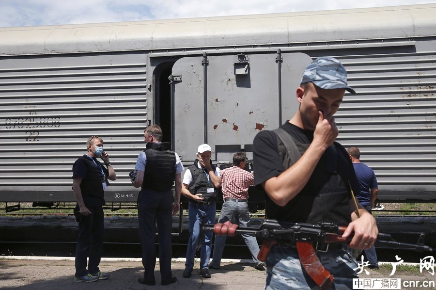 當(dāng)?shù)貢r間2014年7月20日,烏克蘭頓涅茨克Torez,馬航墜機(jī)遇難乘客遺體被裝上列車?yán)洳剀噹麑⒈贿\走。載有部分遺體的火車從距空難現(xiàn)場不遠(yuǎn)的烏克蘭托列茲市出發(fā),前往頓涅茨克市?;疖囯x站前,身處空難現(xiàn)場的歐洲安全與合作組織(歐安組織)代表檢查了運載遺體的5節(jié)冷藏車廂。
