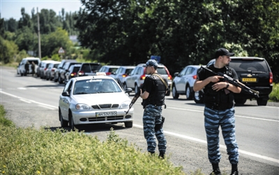 7月28日,來自澳大利亞和荷蘭的調(diào)查人員前往墜機(jī)現(xiàn)場(chǎng)途中,烏克蘭民間組織在其車隊(duì)后面封鎖道路。