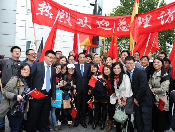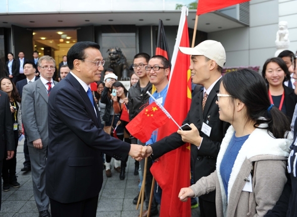 使館主樓外,還有不少中國留學(xué)生。他們打著“歡迎總理訪德”的橫幅,揮舞著中德兩國的國旗。見到克強(qiáng)總理走來,他們一下子圍了上去,爭相與克強(qiáng)總理握手。