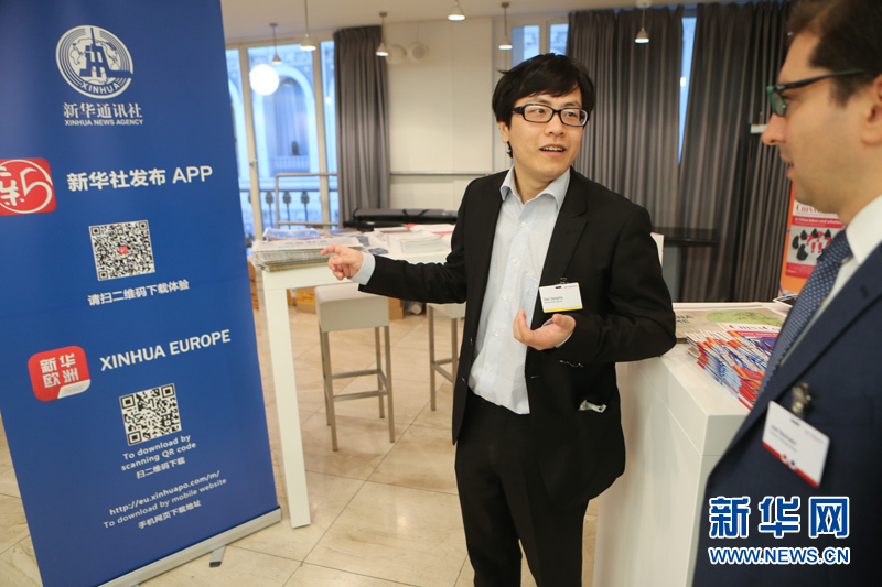 ??? 10月11日,在德國漢堡舉行的中歐論壇漢堡峰會(huì)上,作為此次峰會(huì)的媒體合作伙伴,新華社的工作人員在會(huì)議現(xiàn)場推介新華社發(fā)布和歐洲發(fā)布APP。中歐論壇漢堡峰會(huì)第六屆會(huì)議11日在德國漢堡閉幕。本屆峰會(huì)以“中國與歐洲相遇”為主題。來自中歐政治、經(jīng)濟(jì)和學(xué)術(shù)界的500多位代表聚集在一起,探討中歐經(jīng)貿(mào)合作未來趨勢、中國經(jīng)濟(jì)的綠色發(fā)展等重要議題。新華社記者張帆攝