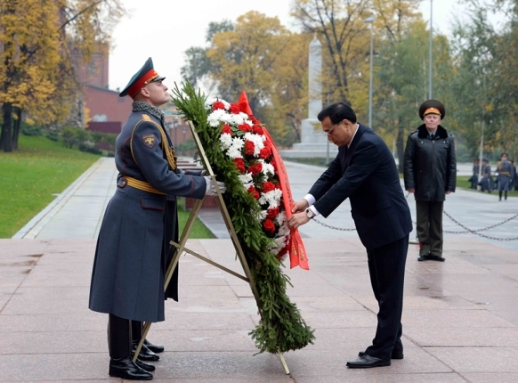 ??? 俄方為李克強(qiáng)總理安排的第一場正式活動(dòng)就是向克里姆林宮外的無名烈士墓獻(xiàn)花圈,意涵豐富深刻。