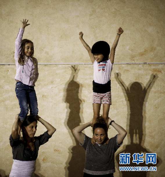 ????Jana(右上)踩在養(yǎng)母Thais(右下)肩上進(jìn)行最基本的“疊人塔”訓(xùn)練。新華社巴塞羅那分社攝影師Pau Barrena 攝