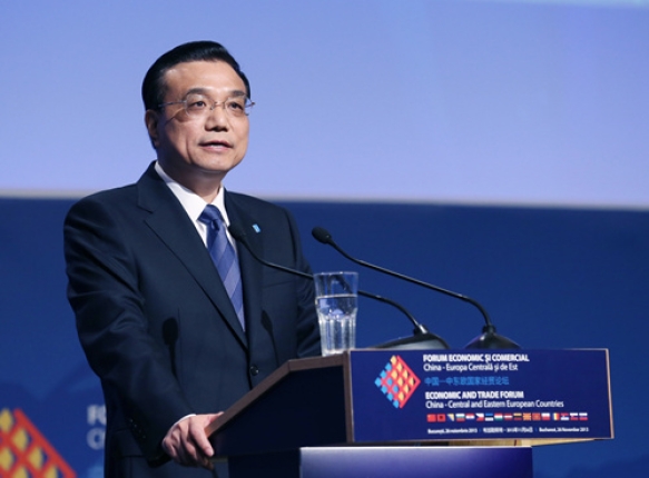 ????圖為2013年11月26日,國務院總理李克強出席第三屆中國—中東歐國家經貿論壇并致辭。當天,李克強在布加勒斯特與羅馬尼亞等13個中東歐國家總理共同出席第三屆中國—中東歐國家經貿論壇并致辭。 新華社記者姚大偉攝