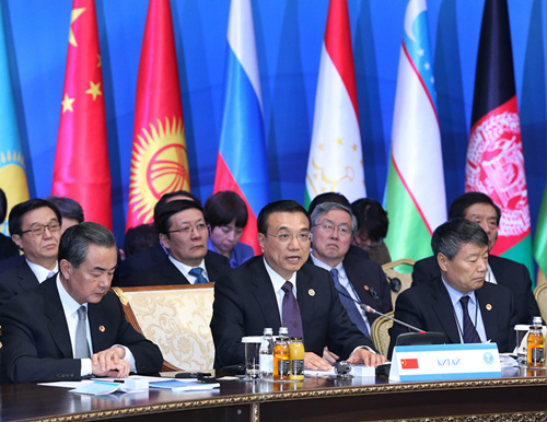 ?。保等瞻⑺顾{獨立宮,克強總理在上合組織成員國政府首腦理事會第十三次會議大范圍會談上提出三點建議:筑牢地區(qū)安全穩(wěn)定屏障,打造區(qū)域合作新亮點,更加注重民生和人文交流合作。