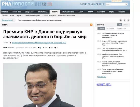 俄新社21日以《中國總理強調以對話促進和平的重要性》為題報道了李克強總理在達沃斯論壇上的致辭。報道中援引了李克強“世界各國都要像愛護自己的眼睛一樣愛護和平”的說法,并指出,中國反對一切形式的恐怖主義。文章寫道,今年是世界反法西斯戰(zhàn)爭勝利70周年,李克強強調了維護戰(zhàn)后國際秩序的重要性。