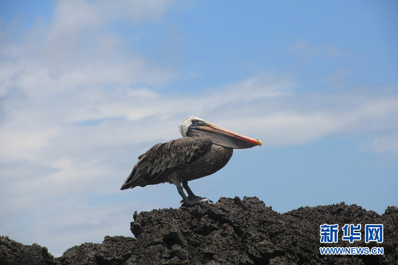 一只褐鵜鶘停在加拉帕戈斯群島中部圣克魯斯(Santa Cruz)島的礁石上。