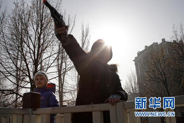 ????資料圖片:2月15日,在烏克蘭東部城市頓涅茨克,一名男孩手持玩具槍在街頭玩耍。烏克蘭武裝力量總參謀部發(fā)言人謝列茲尼奧夫15日說,自當?shù)貢r間凌晨3時起,烏東部沖突地區(qū)的槍炮射擊均已停止,停火協(xié)議得到遵守。 新華社發(fā)(葉爾莫琴科攝)