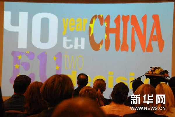 ??? 7月16日,第十屆歐洲外交官研討班開班儀式暨《中國歐盟建交40周年》紀(jì)念畫冊(cè)發(fā)行儀式在京舉行,圖為學(xué)員們觀看中國歐盟四十周年紀(jì)念短片。新華網(wǎng)記者 張藝 攝