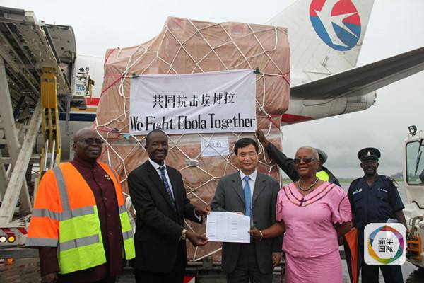 ????2014年8月11日,中國(guó)政府向塞拉利昂提供的抗擊埃博拉疫情緊急人道主義援助物資抵達(dá)塞拉利昂首都弗里敦的隆吉國(guó)際機(jī)場(chǎng)。新華社發(fā)