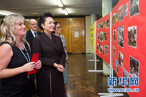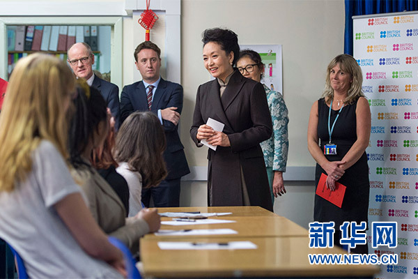 在英國教育部國務(wù)大臣吉布、學(xué)校校長等陪同下,彭麗媛觀看學(xué)生們用中文進(jìn)行的才藝表演,參觀學(xué)校成果展,觀摩中文課,與女學(xué)生們互動交流,并向?qū)W校贈送中國文化及漢語學(xué)習(xí)類圖書及音像制品。
