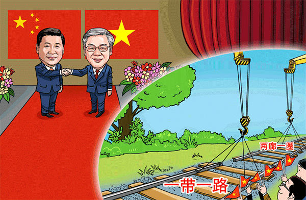 中越是山水相連的友好鄰邦,兩國政治制度相同、發(fā)展道路相近、前途命運相關(guān)。建交65年來,中越雙邊關(guān)系正朝著建設(shè)中越命運共同體的方向不斷前進。習近平此訪,將增進互信,凝聚共識,發(fā)揚中越“好鄰居、好朋友、好同志、好伙伴”特殊情誼,推動中越關(guān)系沿著正確道路繼續(xù)發(fā)展,擴大“一帶一路”和“兩廊一圈”框架內(nèi)務(wù)實合作,推進中越全面戰(zhàn)略合作伙伴關(guān)系邁上新臺階。(作者系中國社會科學院世界經(jīng)濟與政治研究所國際政治經(jīng)濟學研究室副主任徐秀軍 漫畫作者蔡艨)