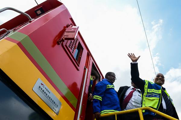 2015年3月19日,南非總統(tǒng)祖馬(右)從“曼德拉一型” 第95臺電力機車上走下來時向大家揮手致意。(新華社記者翟健嵐攝)