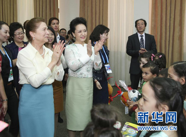 當(dāng)?shù)貢r(shí)間6月22日下午,國家主席習(xí)近平夫人彭麗媛同烏茲別克斯坦總統(tǒng)卡里莫夫夫人卡里莫娃共同參觀塔什干孔子學(xué)院。這是彭麗媛和卡里莫娃為參加演出的學(xué)生鼓掌。新華社記者丁林?jǐn)z