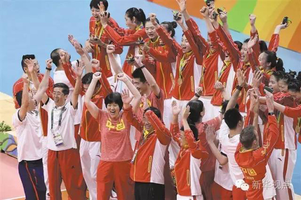 (中國(guó)女排在里約奧運(yùn)會(huì)頒獎(jiǎng)儀式后慶祝。新華社記者王鵬 攝)