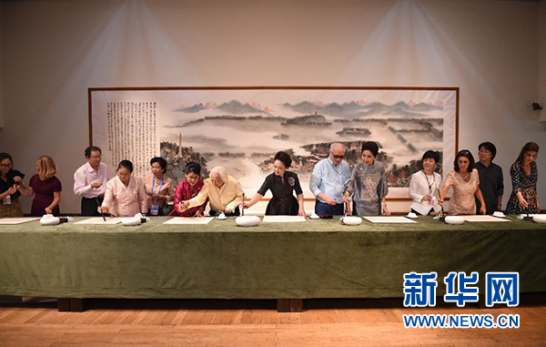 在觀看“意象中國(guó)”書畫展時(shí),彭麗媛和來(lái)賓們?cè)凇段飨o(jì)勝圖》、《朱荷圖軸》等經(jīng)典國(guó)畫作品前駐足觀看,接著欣賞4位著名書畫家現(xiàn)場(chǎng)聯(lián)袂創(chuàng)作書畫作品《江南憶》。一位書法家還為來(lái)賓們現(xiàn)場(chǎng)示范毛筆的執(zhí)筆、運(yùn)筆方式。彭麗媛邀請(qǐng)來(lái)賓們一同書寫漢字“和”。她說(shuō),“和”字在漢語(yǔ)里具有“和平”、“和諧”之義,是我們對(duì)世界的共同心愿。來(lái)賓們饒有興致地拿起毛筆各自書寫,并展示自己的書法作品。彭麗媛說(shuō),昨晚各位在西湖邊觀看了精彩的文藝演出,今天我們?cè)谶@里一同欣賞畫中的西湖。她同來(lái)賓們?cè)趪?guó)畫《西湖秋勝》前合影留念。